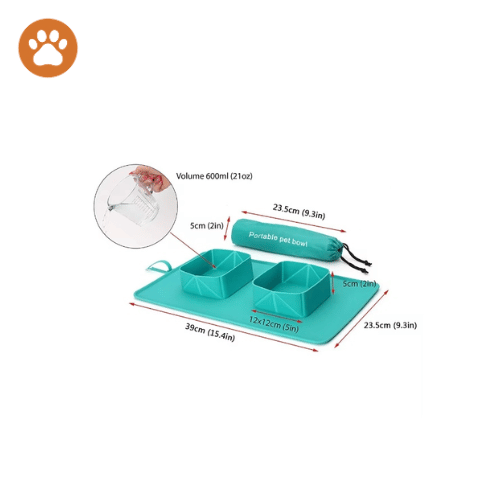 Lightweight, fold-flat silicone travel bowl with two 600 ml wells for food and water. BPA-free, easy to rinse, includes carry bag—perfect for walks, parks, road trips, and camping.